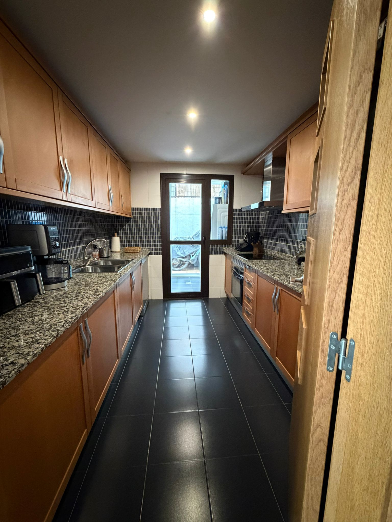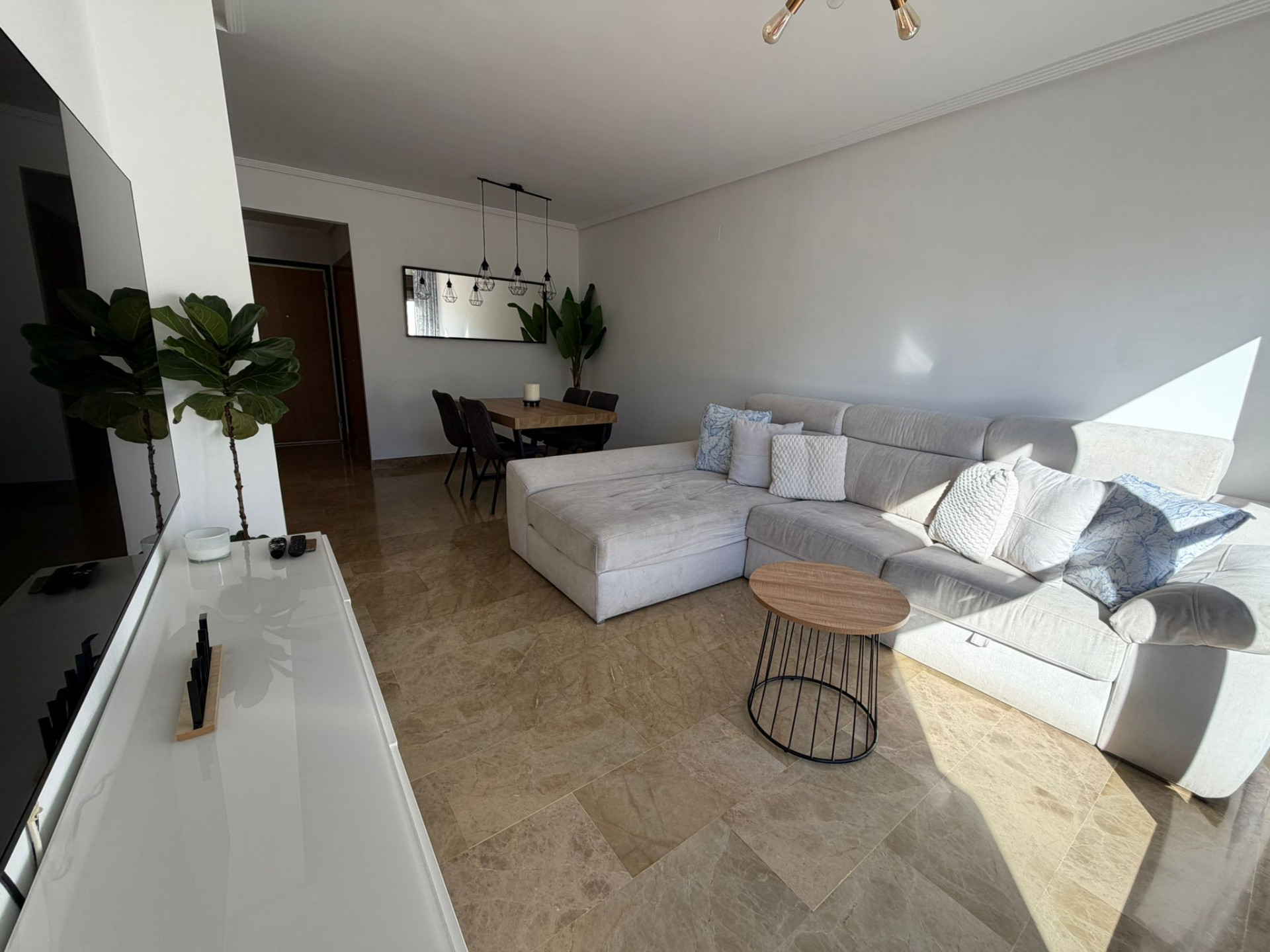 The property features two generous bedrooms with built-in wardrobes and two full bathrooms, ensuring comfort and practicality. The highlight is the stunning 50 m² main terrace, perfect for year-round al fresco living, entertaining guests, or creating a relaxing chill-out zone under the sun. An additional small terrace offers extra storage or utility space. The bright, east-facing apartment includes a spacious living-dining area, a fully equipped kitchen, air conditioning, central heating, and high-quality finishes like marble flooring.