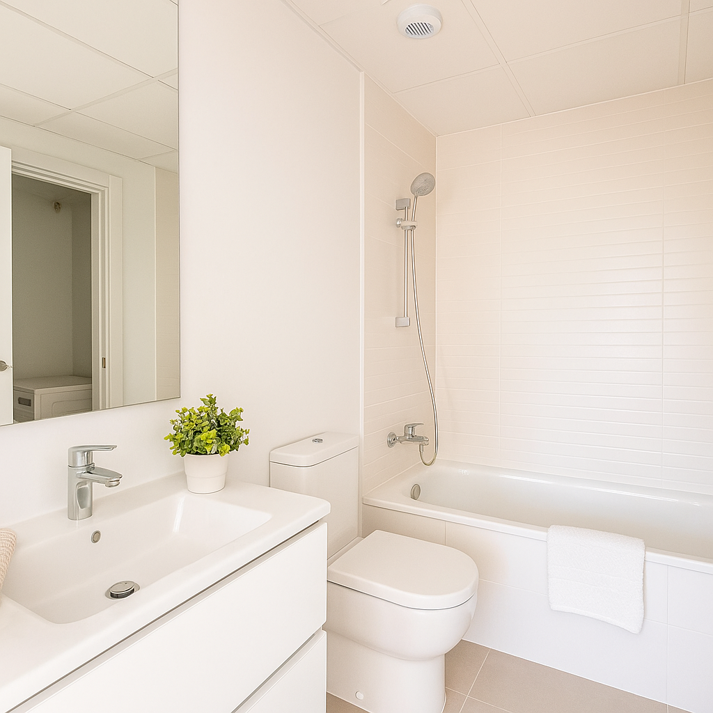 This bright and contemporary home offers a spacious open-plan layout that seamlessly connects the fully equipped kitchen, dining area and living room. Large floor-to-ceiling sliding doors lead directly onto a generous terrace of approx. 20 m², perfect for outdoor dining, relaxing or enjoying the Mediterranean climate.