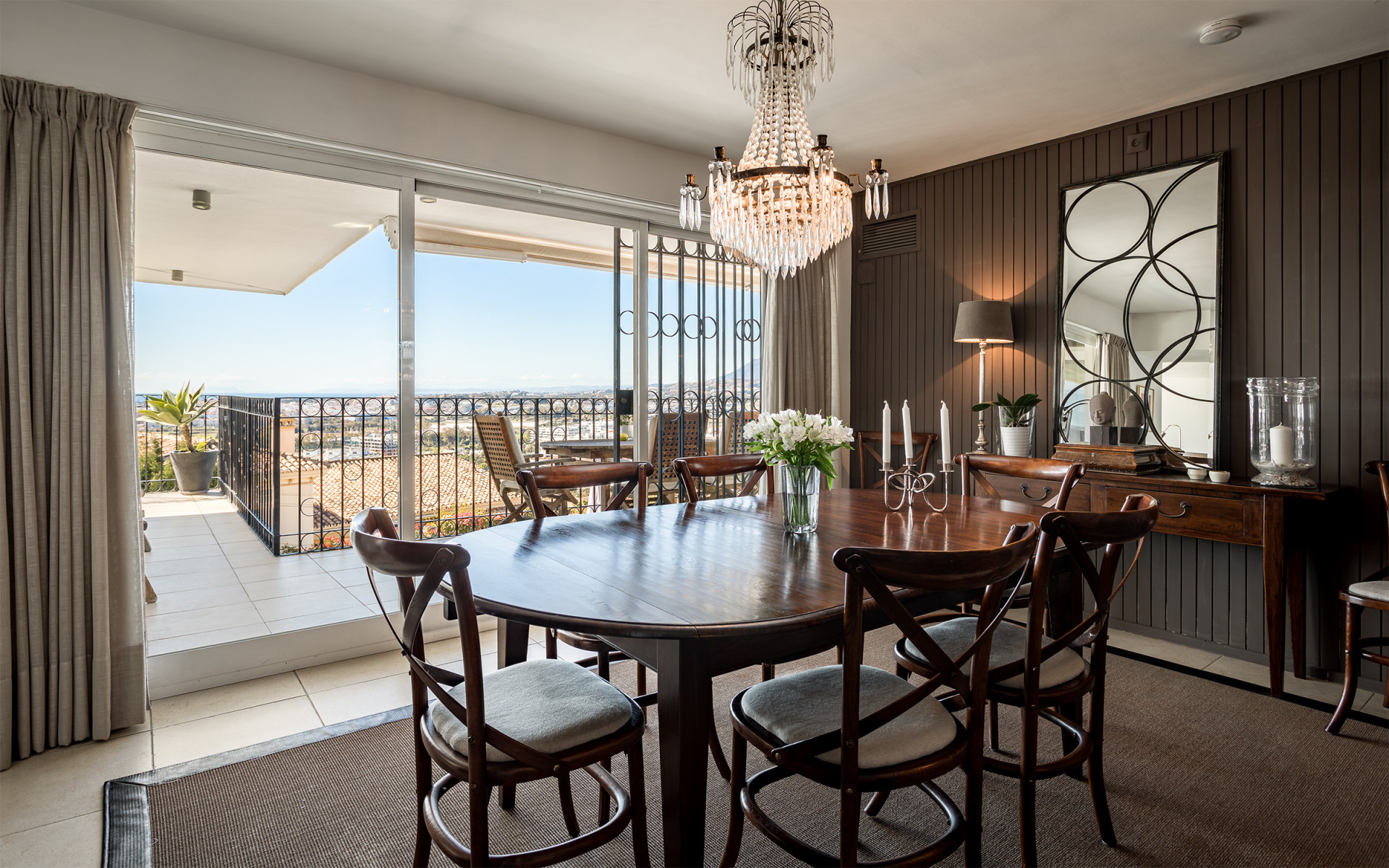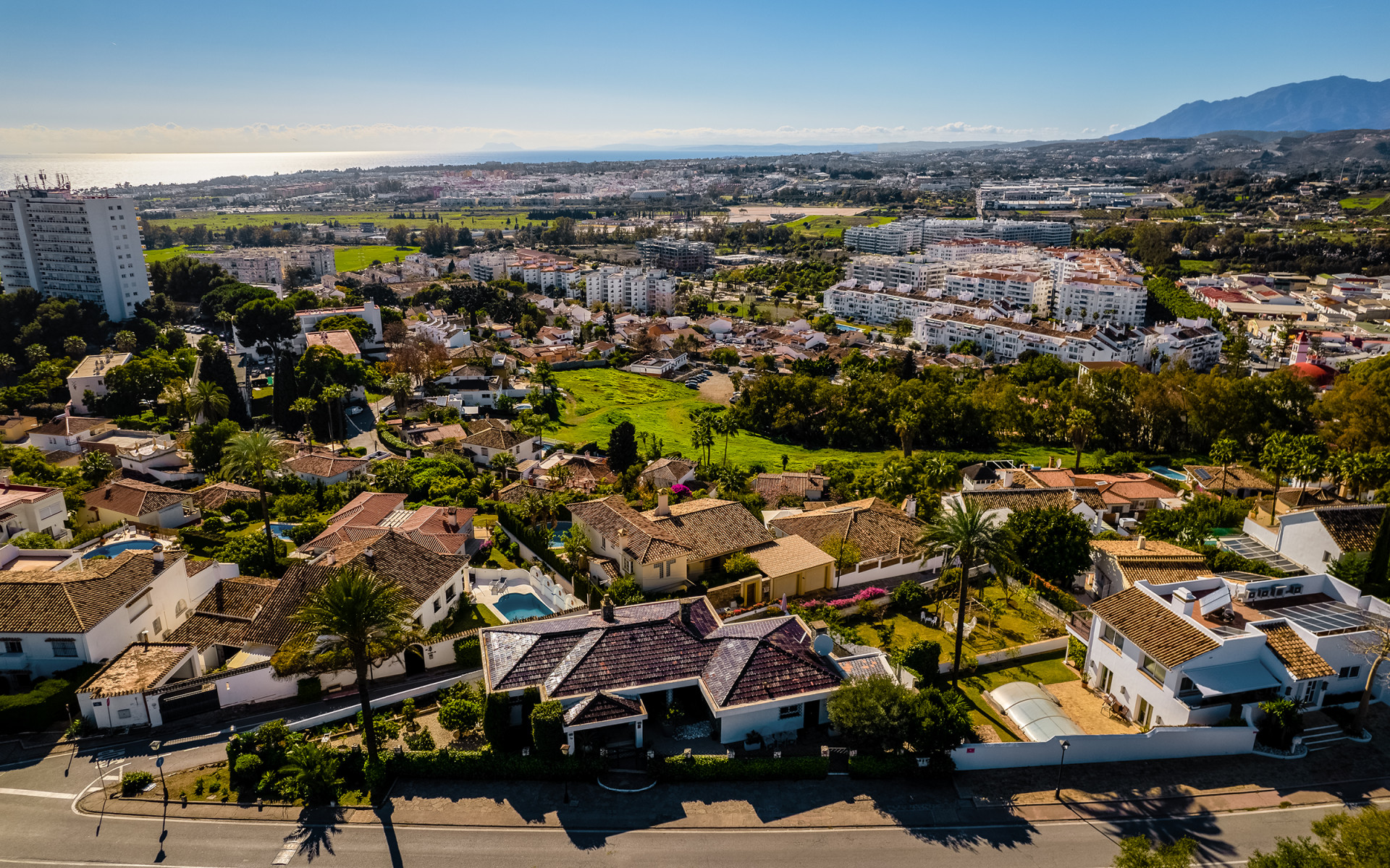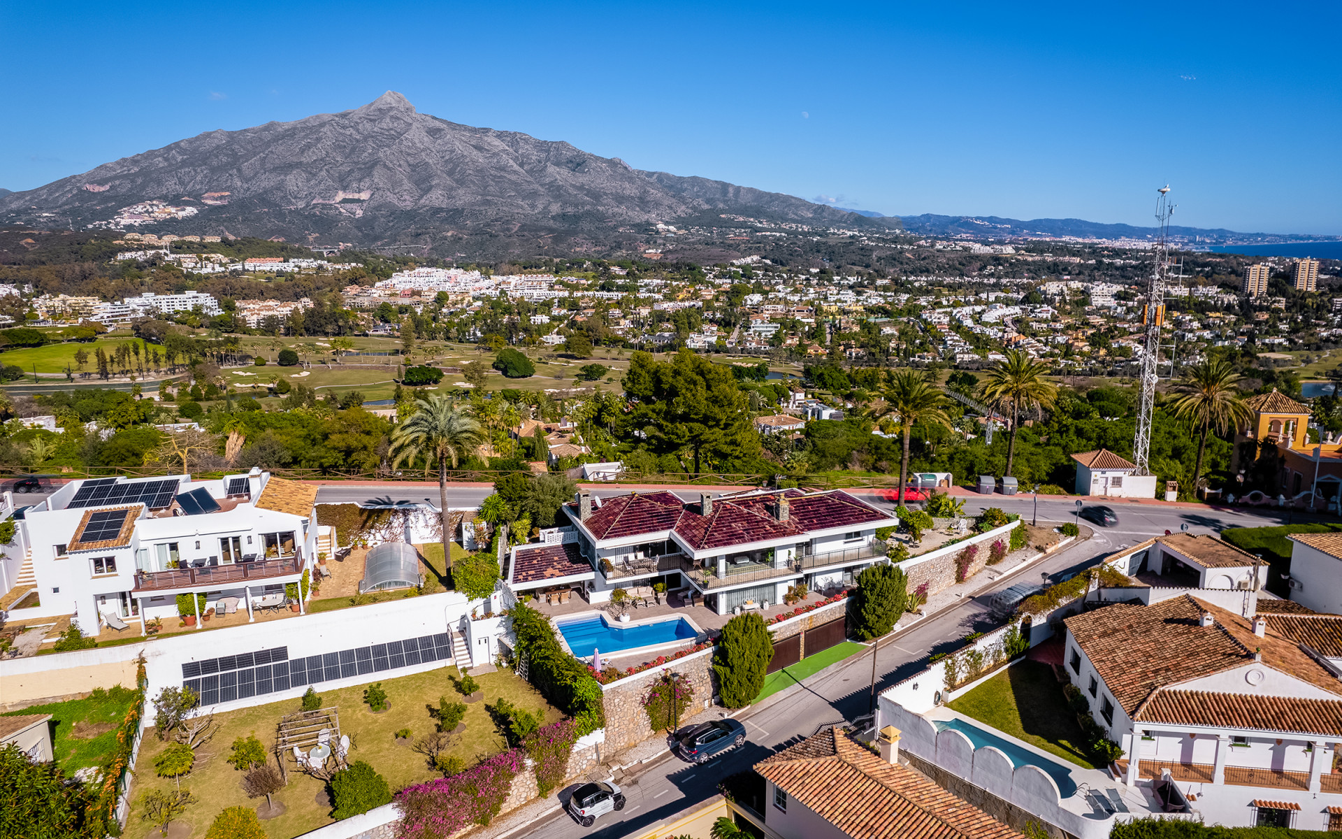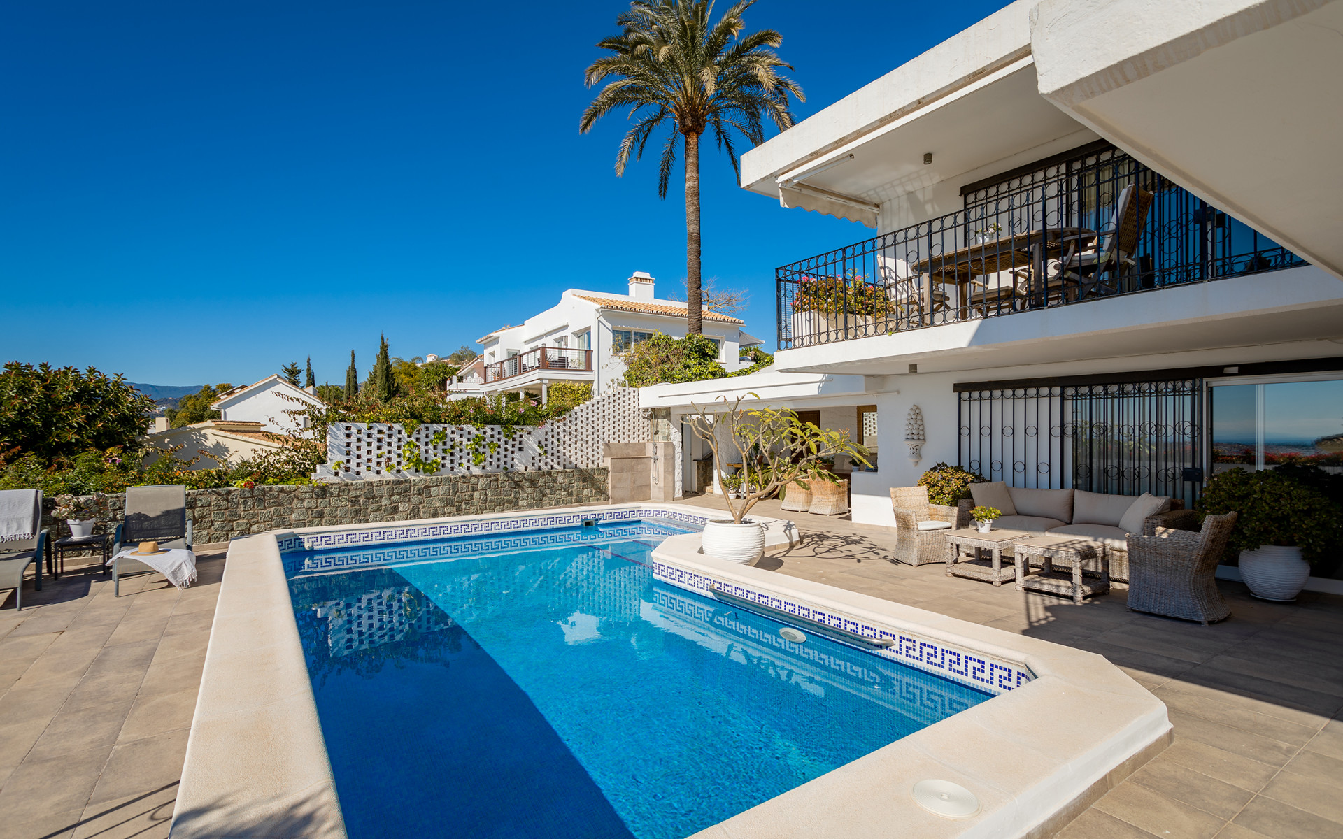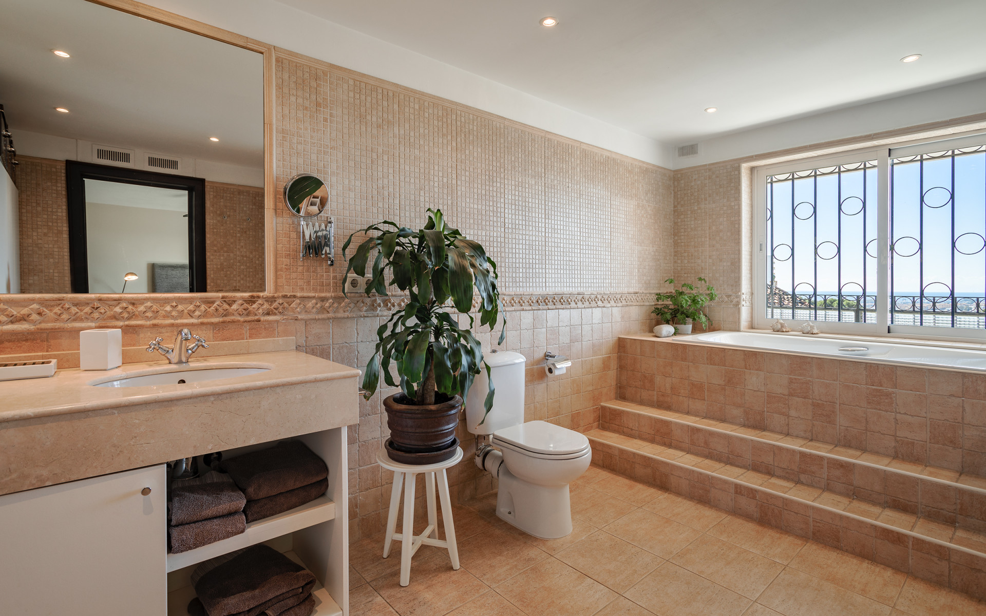 Fantastic villa with panoramic sea views walking distance to amenities in Nueva Andalucia. Built on three levels, property comprises, on entrance level: en-suite master bedroom; living/dining room with fireplace and access to the terraces enjoying the panoramic sea views; fully equipped kitchen with laundry room & dirty kitchen with separate entrance; guest toilet. Middle floor: double sitting room with fireplace and access to the heated swimming pool & bbq area; an office; 2 bedrooms sharing a bathroom; and a guest toilet. Basement: en-suite bedroom; garage with space for 4 cars; 2 large storages; a tool workshop; a wine cellar; the machinery room. Extra features include: alarm system; underfloor heating in the bathrooms; solar panels for the whole electric system. A property with lots of potential just a 5-minute drive (or 25-minute walk) to the beach and Puerto Banús.